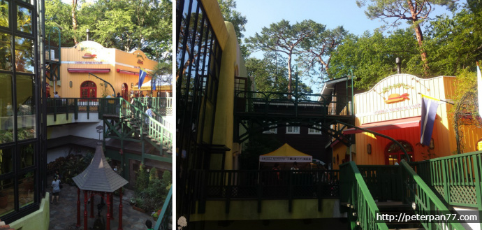노란색 건물이 카페 무기와라보우시입니다. 그리고 그 안쪽으로 핫도그랑 아이스크림을 파는 가게도 있어요.