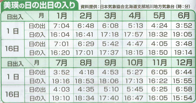 홋카이도 대략적인 일출, 일몰 시각 (비에이 기준)